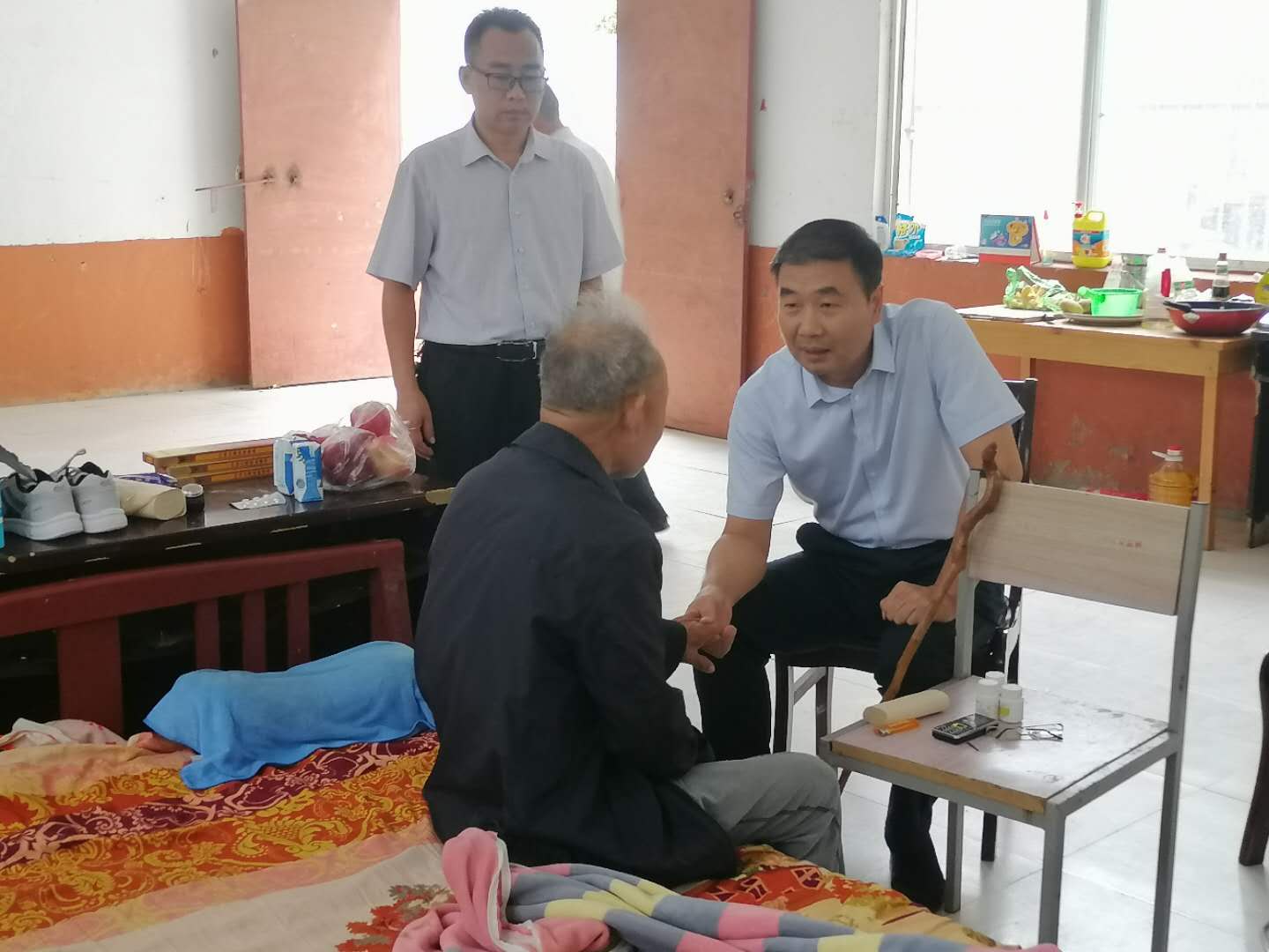 當日16時,在三李村村室旁邊的一間房屋內(nèi),孔陽一見到坐在床頭的張殿運,就緊緊拉住他的手,詳細詢問老人吃的什么藥、效果怎么樣、身體恢復得如何?他叮囑老人:“你保重好身體就是對兒子工作的支持,也是對商水縣扶貧工作的支持。”張殿運說話困難,表達不清,嘴唇顫抖半天也說不出一句話,只是緊緊地握住孔陽的手。得知老人在鹿邑縣宋河鎮(zhèn)農(nóng)村當村干部30多年,孔陽稱贊他為黨為民工作一輩子,是好樣的。