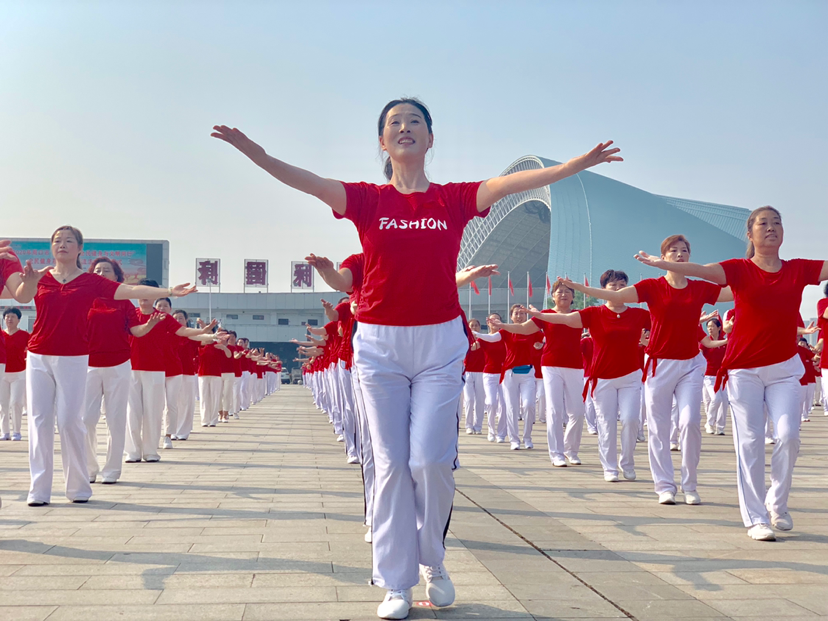 在活動(dòng)現(xiàn)場,身穿紅色上衣,白色長褲的廣場舞愛好者隨著音響里傳來的指令,面帶笑意舞動(dòng)著。