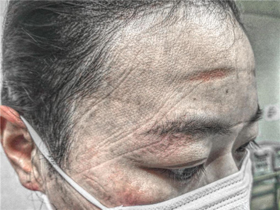 因?yàn)樾鹿诜窝椎膹?qiáng)傳染性,胡奔奔每次去病區(qū)上班都要全副武裝,而且為保證在6個(gè)小時(shí)的工作時(shí)間內(nèi)不被暴露,不能去衛(wèi)生間,不能喝水,還要穿上成人紙尿褲以防萬(wàn)一。這樣下來(lái),汗?jié)褚路浅J拢蚁掳嗪竺摰舴雷o(hù)裝備后,她原本清秀白皙的臉上,滿(mǎn)是深深的皺褶,久久難以恢復(fù),惹人心疼。給家人報(bào)平安時(shí),胡奔奔甚至不敢視頻聊天,只能語(yǔ)音安慰家人。