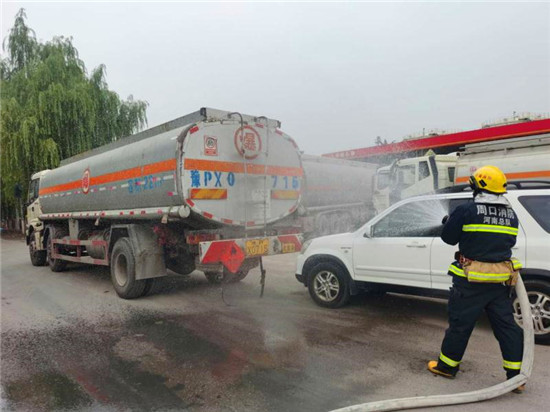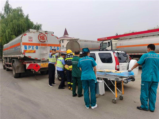 當(dāng)日上午10時(shí),商水交警大隊(duì)指揮中心接到報(bào)警:在商水縣興商大道與陳勝大道交叉口西、湯莊油庫處,一輛轎車與一輛?;饭捃囎肺蚕嘧?,正常罐體損壞,?;沸孤镀鸹穑I車駕駛室變形,駕駛?cè)吮焕к噧?nèi),如不及時(shí)救援,駕駛?cè)擞猩kU(xiǎn),另外因事故現(xiàn)場(chǎng)臨近湯莊油庫,如不及時(shí)處置可能發(fā)生爆炸,后果不堪設(shè)想。