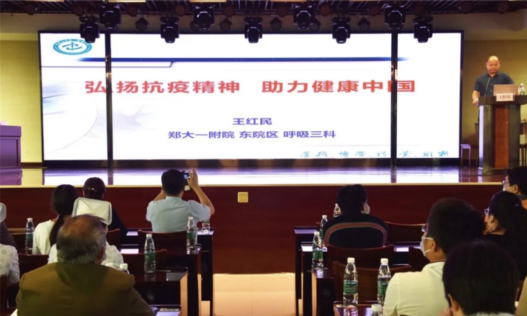 王紅民教授曾經(jīng)參加河南省援鄂醫(yī)療隊(duì),他給大家分享了在武漢第一家方艙醫(yī)院——江漢方艙醫(yī)院工作時(shí)的抗疫故事,當(dāng)王教授說起援鄂醫(yī)療隊(duì)“疫情不退,絕不言歸”的口號(hào)時(shí),臺(tái)下響起雷鳴般的掌聲。