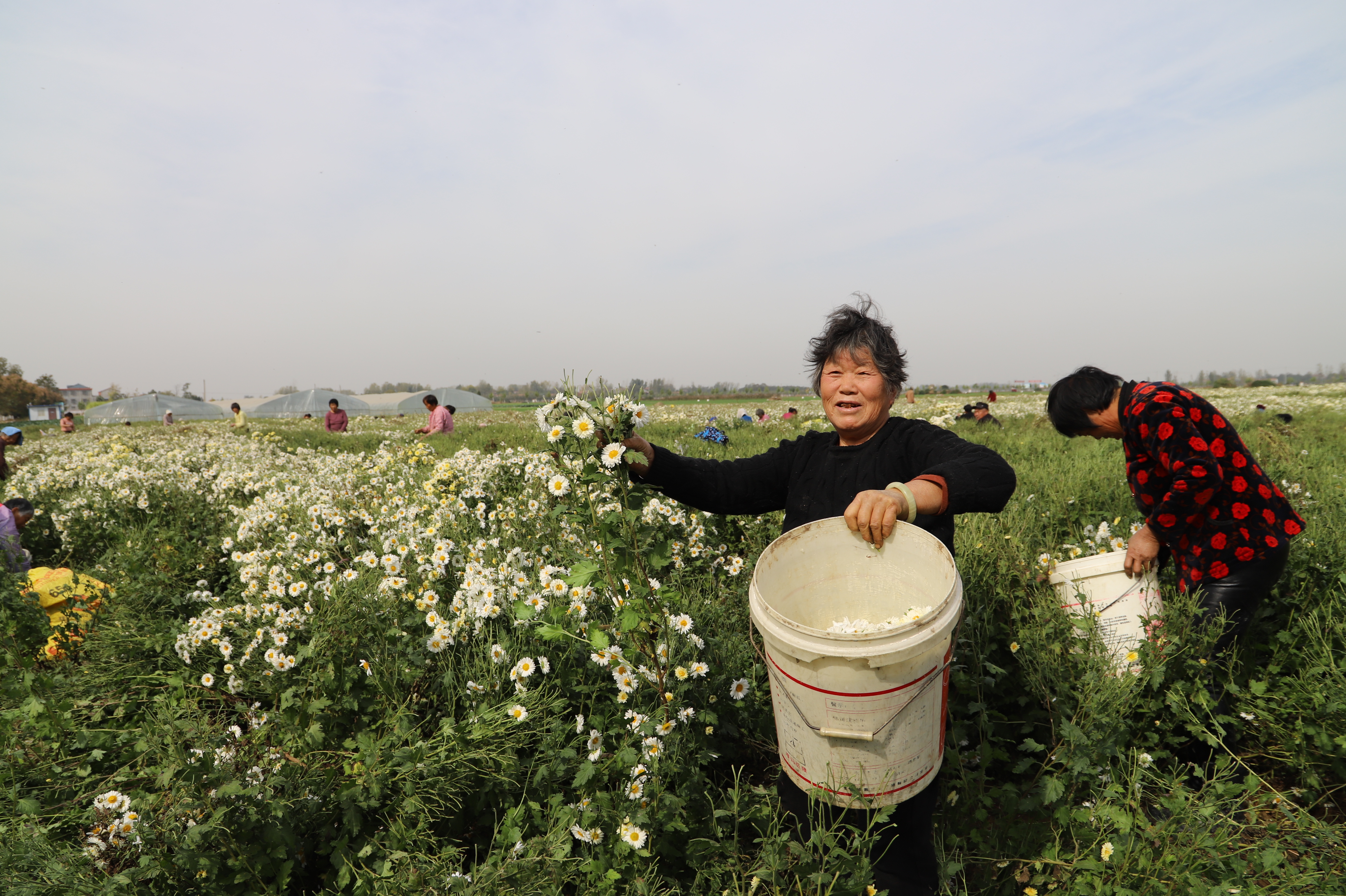 “她四十來(lái)歲,年輕手兒快,一天能摘300斤,掙100多元?!毖蠹伊w慕的眼光和手指的方向,記者來(lái)到晉潘潘身邊。果然,別人拿的都是塑料桶,她帶的是一個(gè)大編織袋,而且一人把持2米寬的地壟。只見(jiàn)她雙手順著菊花的莖向上一捋,滿滿兩把菊花應(yīng)聲而落,而且很少有碎花現(xiàn)象。聽(tīng)著大家的夸贊,晉潘潘得意地說(shuō):“我掙錢(qián)多請(qǐng)大家喝菊花茶。”