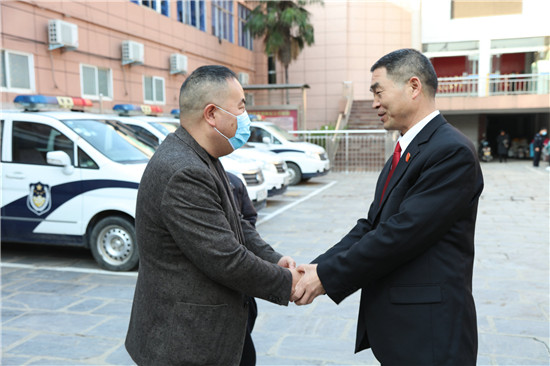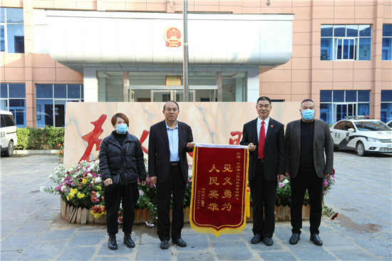 11月19日,侯某某夫婦將一面寫有“見義勇為 人民英雄”的錦旗送到太康縣人民法院法官楊鵬飛手中,表達(dá)一家人對(duì)楊鵬飛救助落水女兒的感激之情。
