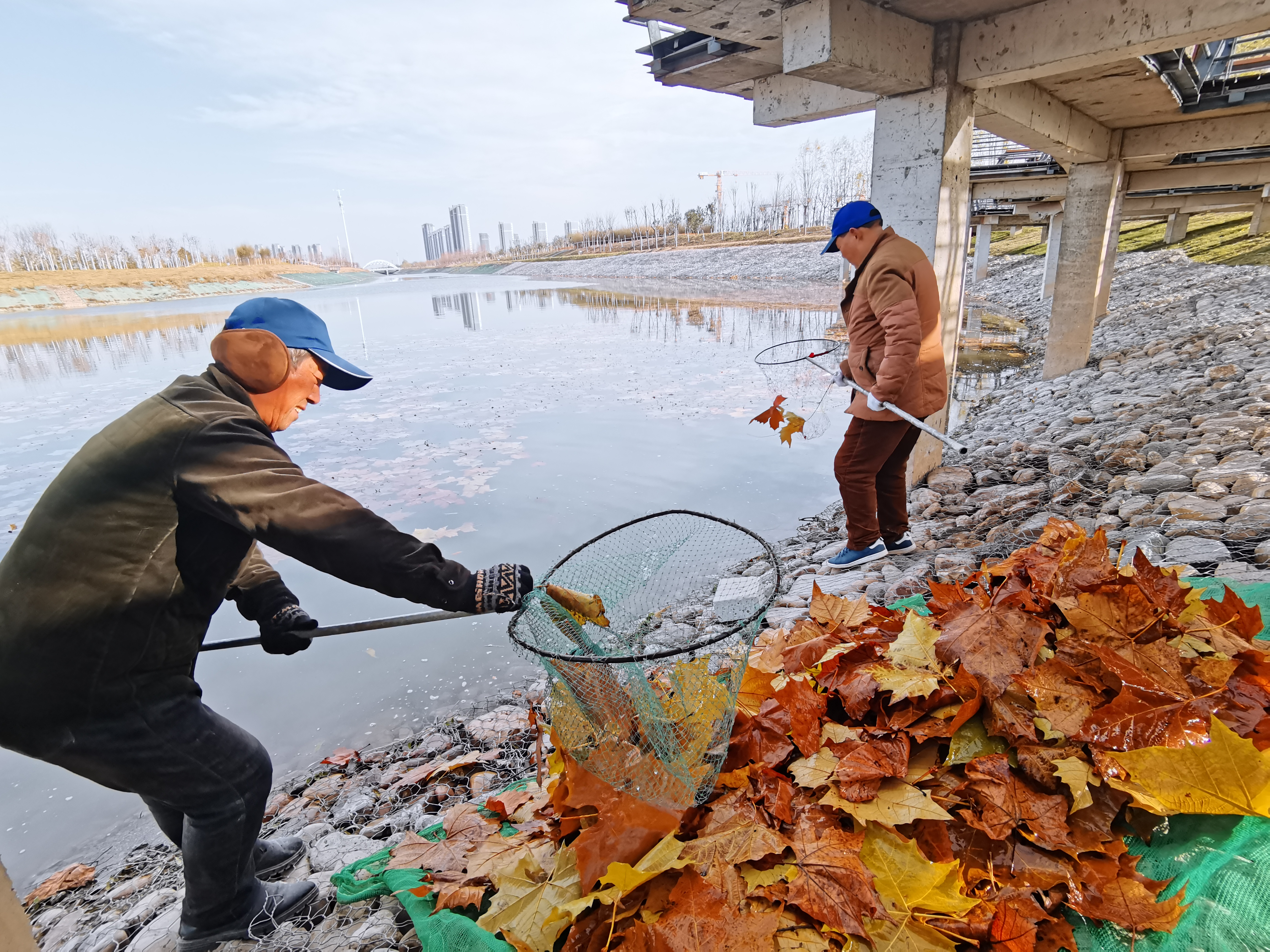 12月14日,環(huán)衛(wèi)工人在清理沙潁河水面上的枯樹葉等垃圾。最近,我市氣溫下降,枯樹葉紛紛落下,為了保持市區(qū)街道的干凈整潔,環(huán)衛(wèi)工人需要不斷地進行清掃,任務十分艱巨。為防止清掃好的樹葉被風刮走,環(huán)衛(wèi)部門專門為環(huán)衛(wèi)工人配血封閉式三輪車、大號編織袋,盛放枯葉,最后樹葉由環(huán)衛(wèi)工人送往垃圾中轉站統(tǒng)一處理。
