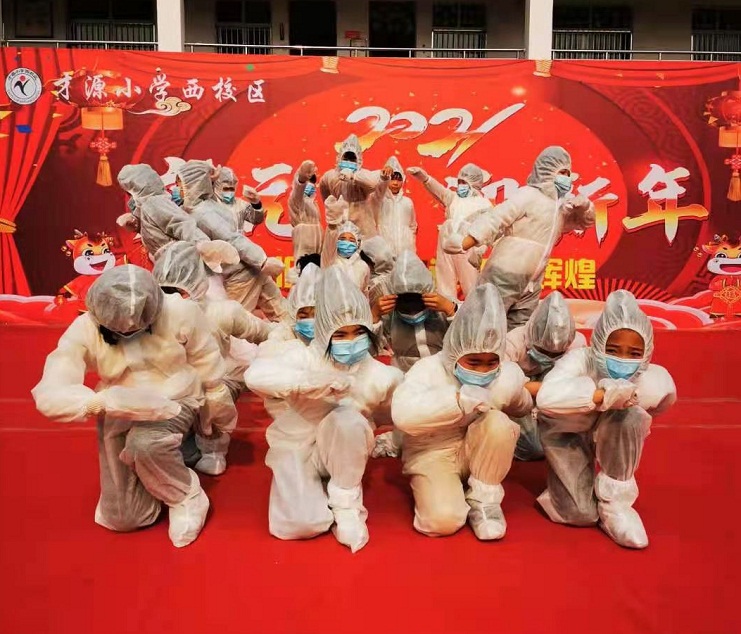 在該縣才源小學(xué)西校區(qū),三年級三班、四班、六班、八班合作編排了《與時間賽跑》情景劇,充分展示了在抗擊疫情期間,醫(yī)護人員奮勇當先的責(zé)任擔當,逆行出征的義無反顧,風(fēng)雨兼程的無私奉獻。舞臺上,孩子們的精彩表演,獲得了陣陣掌聲。