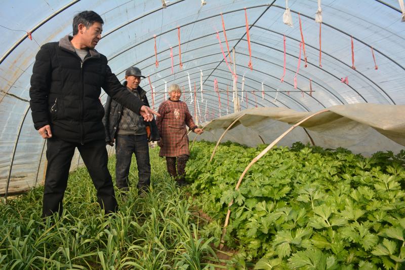 商水縣平店鄉(xiāng)葛樓村70多歲的菜農(nóng)楊志新、朱妮老兩口通過(guò)“棚套棚”“ 番茄—芹菜、蒜苗—芫荽”輪作套種,每畝大棚比傳統(tǒng)種法增收5000余元。圖為1月17日,村干部深入田間走訪了解其生產(chǎn)銷售及惠農(nóng)政策享受情況。