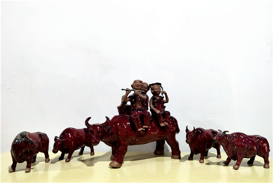 春節(jié)前夕,鄲城泥塑大師張振福歷時多日制作一組鈞瓷泥塑群雕《瑞牛賀新春》。該組作品分為三頭長約90厘米的大牛和若干頭小牛,均為鈞瓷泥塑,采用豫東黃泥和粗獷手法制作,上釉時入窯一色,歷經(jīng)1200多攝氏度高溫?zé)坪蟪龈G萬變,十分精彩。拓荒牛精神,展現(xiàn)中國人自立自強(qiáng)的志氣;孺子牛精神,體現(xiàn)在創(chuàng)造美好生活的時代課題中;老黃牛精神,貴在“心有大我、至誠報國”的奉獻(xiàn)品格。