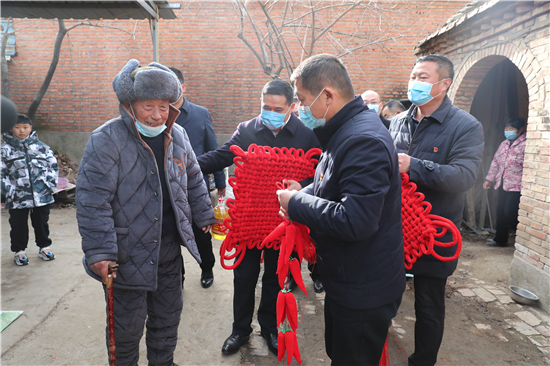 在鄭家集鄉(xiāng)韓樓村,縣農(nóng)商銀行鄭家集支行行長武繼龍帶領(lǐng)員工來到92歲韓老漢的家中,看到韓老漢由于身體原因只能靠拐棍佝僂著背站著,武繼龍緊忙彎腰俯下身說:“大爺,快過年了,我們來看看您,提前給您拜個早年!”“真的是太感謝恁了,這么冷的天,還讓你們來送到家里面?!表n老漢激動地說。