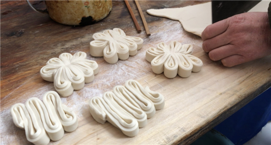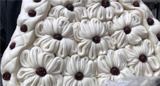 除了平常的白面饅頭,黃師傅還讓妻子現(xiàn)場展示了“棗山”制作,并介紹了棗山的寓意和習(xí)俗。“你看這棗山是一層一層的,寓意著步步登高,而且棗山的花形是圓的,代表著團(tuán)團(tuán)圓圓。過去出嫁的閨女過年回娘家要帶大饃,娘家要回棗山,現(xiàn)在咱們周口的一些地方還保留著這樣的習(xí)俗?!眱晌恢鞑ンw驗(yàn)了棗山的制作過程,得到黃老板妻子的夸獎:“中!這倆妮兒可巧!”