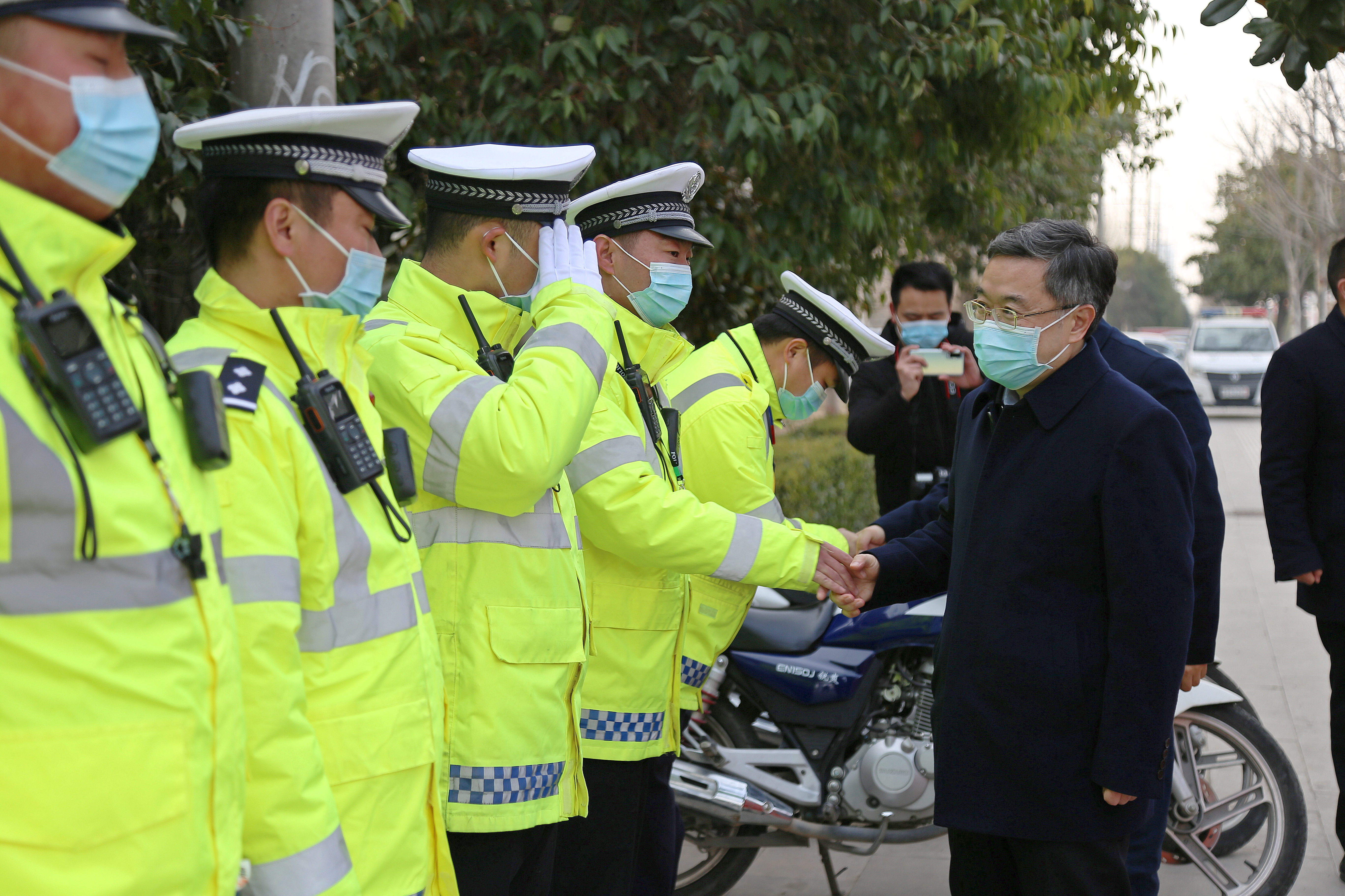 在縣交警大隊(duì)城區(qū)新區(qū)中隊(duì)五岔路口執(zhí)勤點(diǎn),皇甫立新、劉國慶同正在執(zhí)勤的交通民警一一握手,并代表縣四個(gè)班子向交警大隊(duì)全體民警、協(xié)警一年來付出的努力和辛苦表示感謝和問候,囑咐他們要注意安全,保重身體。在詳細(xì)聽取春節(jié)期間治堵保暢工作情況匯報(bào)后,皇甫立新對(duì)交警大隊(duì)全體民警和輔警在春節(jié)期間舍小家為大家,始終堅(jiān)守崗位保暢通的工作態(tài)度,以及無私奉獻(xiàn)、任勞任怨的工作作風(fēng)給予高度評(píng)價(jià)。并希望大家在春節(jié)期間,繼續(xù)發(fā)揚(yáng)吃苦耐勞的精神,科學(xué)做好道路安全保障工作,克服車多人多等困難,確保春節(jié)期間全縣道路交通安全暢通,讓全縣人民愉快度過一個(gè)平安、祥和的春節(jié)。同時(shí)要求縣交警大隊(duì)要進(jìn)一步做好執(zhí)勤民警后勤保障及防寒保暖工作,加強(qiáng)人員輪換上崗,切實(shí)保障公安交警切身利益,解決他們的后顧之憂。