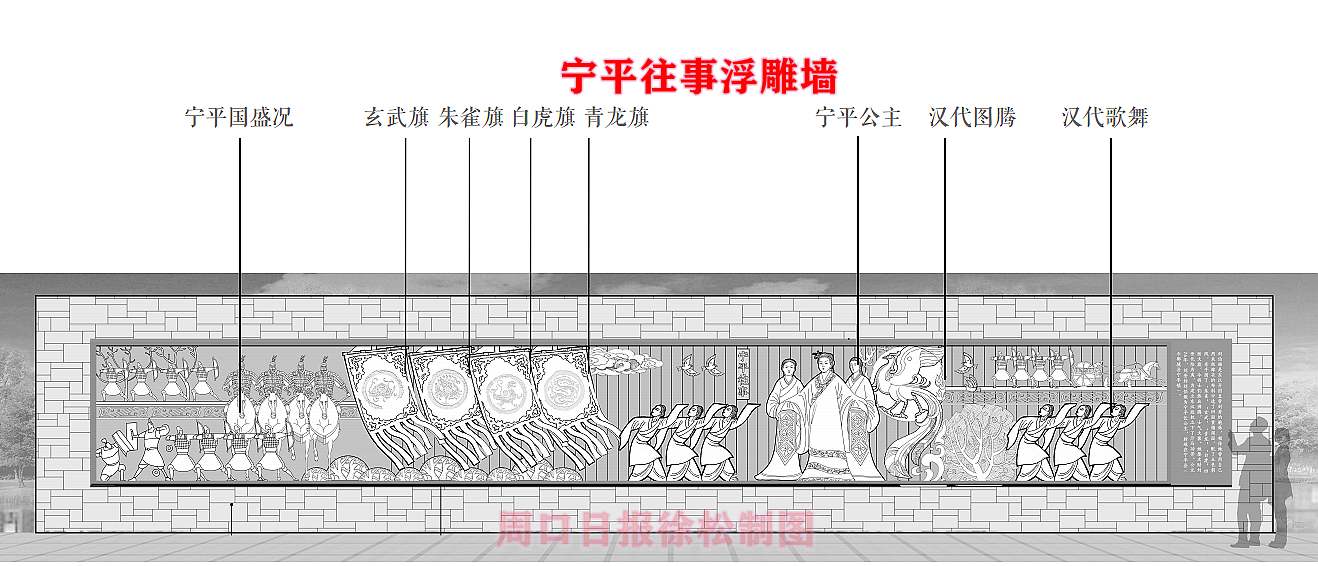 在縣委、縣政府綜合大樓東側的核心形象段,配合鄲城行政中心打造莊嚴、大氣氛圍的同時,對鄲城歷史文化進行了集中展示,包括鄲城的歷史沿革,鄲城的發(fā)展理念,歷史故事等。其中調水渠西側以現(xiàn)有人民廣場對應的綠地為基礎,設置了較多的歷史文化節(jié)點。如調水渠新華路橋頭北側的廉政文化廣場,講述了漢朝名臣汲黯的故事。汲黯為人耿直,直諫廷諍,親政愛民,敢于承擔責任,漢武帝劉徹稱其為“社稷之臣”。汲黯廉政廣場建設在此處更有著深遠的意義,它一方面提醒老百姓要了解歷史、敬畏先賢,同時也激勵著鄲城縣的各級黨員干部要在習近平新時代中國特色社會主義思想引領下,“不忘初心、牢記使命、廉潔奉公、一心為民”。