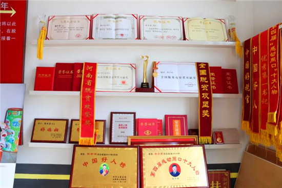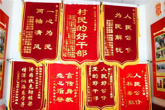 路修好了,村民為韓宇南送來了第一面錦旗。在以后的幾年里,群眾多次自發(fā)給韓宇南送來錦旗,近40面錦旗重重疊疊掛滿了村委會的整個(gè)北墻。