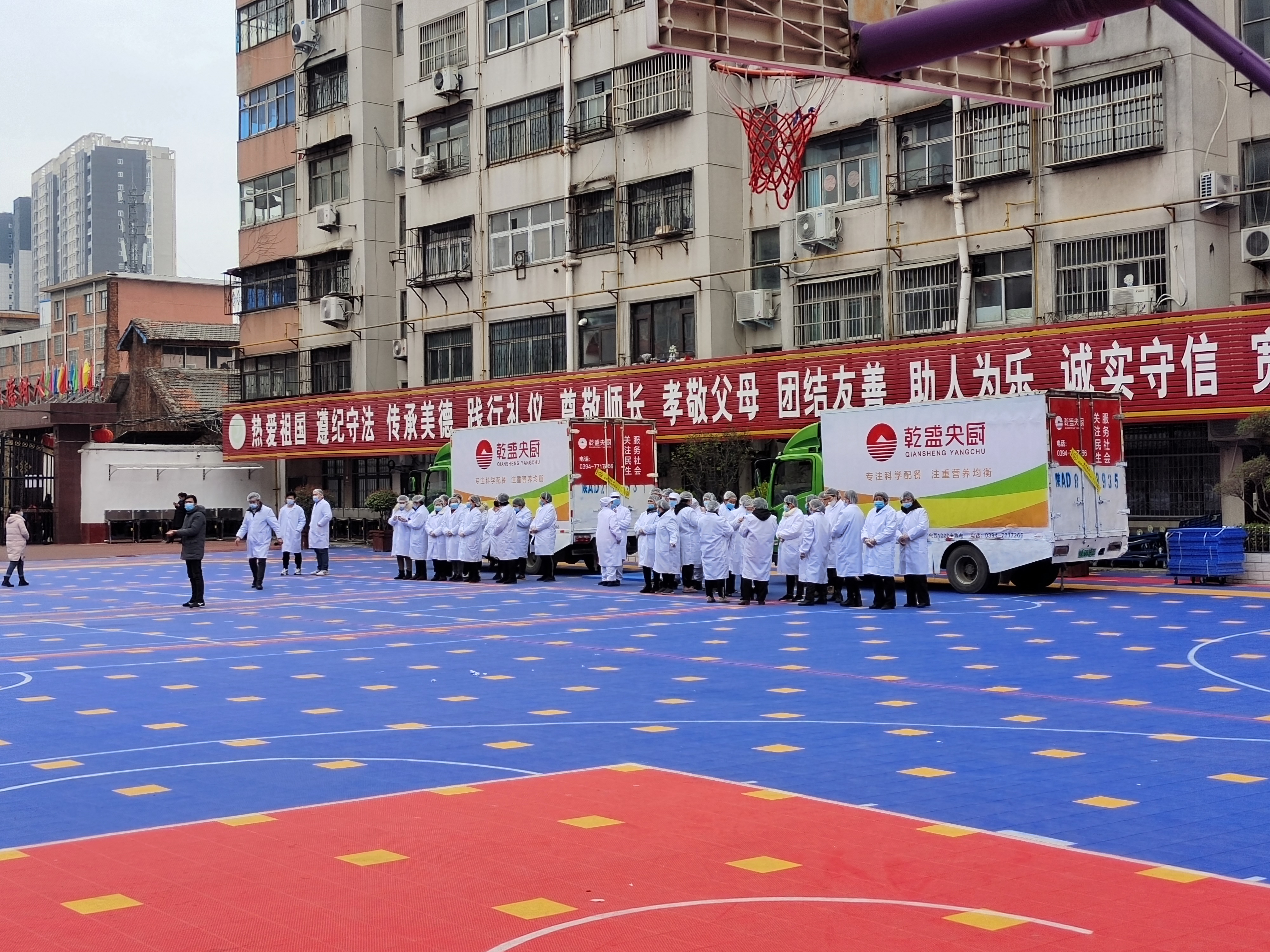 11時許,13000余份熱騰騰的飯菜即將送到周口市中心城區(qū)中小學(xué)生手中,直播團(tuán)隊對七一路二小的配送情況進(jìn)行現(xiàn)場直播。兩輛運餐大卡車,20余名工作人員整裝待發(fā),乾盛央廚鄭州總公司的營銷部負(fù)責(zé)人現(xiàn)場指揮調(diào)度七一路二小的發(fā)餐工作。揭掉卡車上的封條,留樣,測溫,裝車,按班分送,分發(fā)不銹鋼餐具,“哇!獅子頭?。 痹诤⒆觽兊捏@呼聲中,兩葷一素,一份米一份湯,熱氣騰騰地盛到孩子手中的餐具中。“孩子們吃不吃的飽呀?”面對各直播平臺上網(wǎng)友的提問,乾盛央廚鄭州總公司營銷部負(fù)責(zé)人回答:“我們提前有準(zhǔn)備,飯、菜我們都免費加,保證孩子們都吃飽,請家長朋友們放心?!?/p>