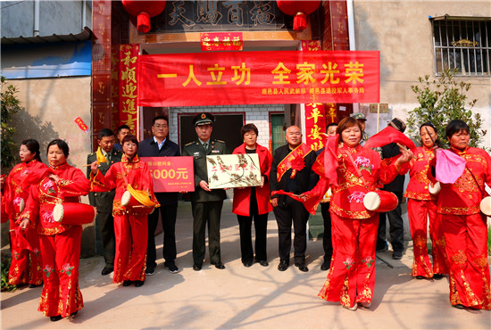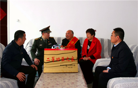 李峰說:“一張立功喜報,不僅是軍人榮譽的象征、成長進(jìn)步的見證,也承載著軍人家屬的期盼與慰藉。功臣是實現(xiàn)強軍興軍目標(biāo)的尖兵,他們在部隊建功立業(yè),我們力所能及服務(wù)保障好他們的家人,積極在全社會營造起‘功臣受愛戴、軍人受尊崇、軍屬受尊敬’的氛圍。”為此,鹿邑縣人武部積極構(gòu)建軍人軍屬榮譽體系,每逢重大節(jié)日,都要協(xié)調(diào)地方黨委、政府開展為現(xiàn)役軍人和軍屬送喜報,掛功臣匾、光榮牌等活動,通過活動激勵等形式,讓軍人軍屬享有更多的“專屬榮光”,努力營造“一人參軍,全家光榮;一人立功,全村光榮”的濃厚氛圍,更加堅定了軍屬支持子女獻(xiàn)身國防的決心,進(jìn)一步激發(fā)了鹿邑籍官兵獻(xiàn)身軍營、報效祖國的積極性。②9