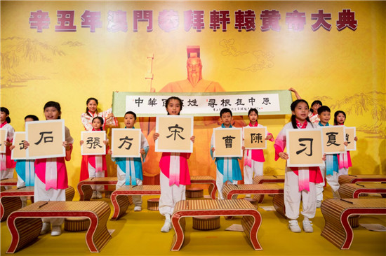 在儀程“高唱頌歌”環(huán)節(jié),30名澳門小學(xué)生身穿漢服,邊唱《黃帝頌》邊在小書桌上書寫毛筆字。隨后,孩子們舉起書寫的姓氏,后排兩名身穿漢服的老師打開“中華百家姓”卷軸,引來參加拜祖活動的來賓陣陣掌聲。今年拜祖活動現(xiàn)場組織了一個百人的漢服方陣,順應(yīng)流行的“國潮風(fēng)”,成為拜祖活動的又一個亮點。