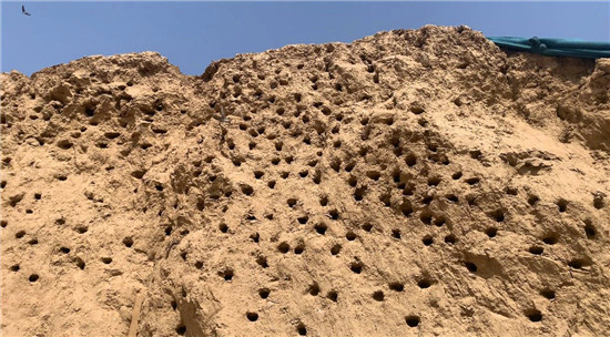 黃土堆壁上,鳥巢密布區(qū)域沒有覆蓋防塵網(wǎng)。邱一帆 攝