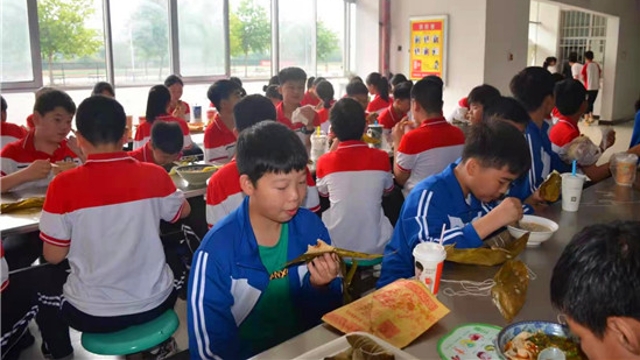• 6月14日,端午節(jié),鄲城縣第二實(shí)驗(yàn)中學(xué)朱玉良、李繼元等校領(lǐng)導(dǎo)在餐廳和學(xué)生一起集體過(guò)端午。
