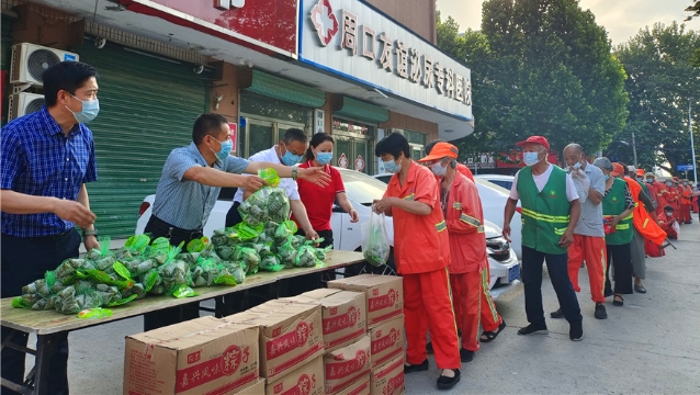 • “真是太感謝了,志愿者們?yōu)槲覀儼聂兆?,吃到嘴里,暖在心里。一直以?lái),黨和政府對(duì)我們保潔員都很關(guān)心”西華縣龍池頭村保潔員宋海軍笑著說(shuō)。