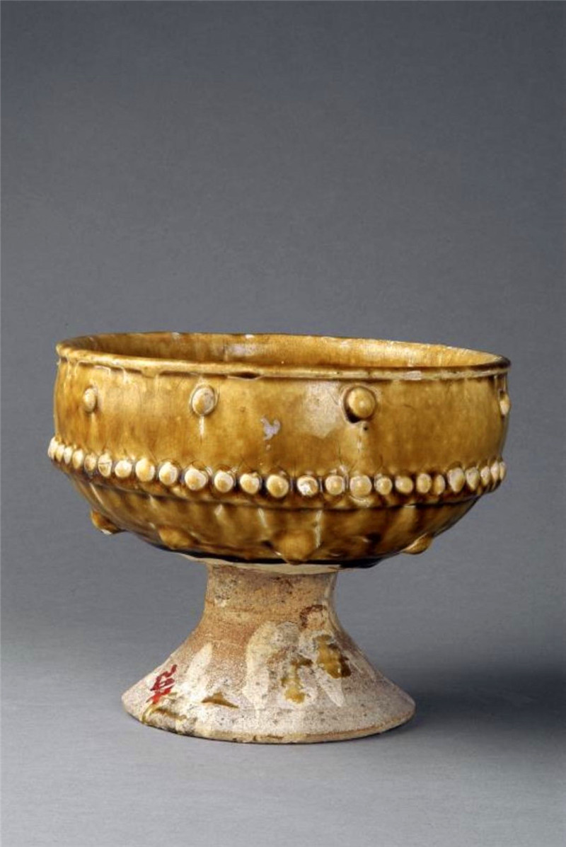 壽州窯主要生產(chǎn)與生活相關(guān)的碗、盞、杯、缽、注子等,其生產(chǎn)的高檔產(chǎn)品深受當(dāng)時富貴之家追捧。唐代是中國歷史上的盛世,社會經(jīng)濟繁榮,黃釉瓷與體現(xiàn)皇權(quán)的皇家貴族崇尚的富貴色彩不謀而合,所以黃釉瓷器很快受到社會的熱捧,黃釉瓷豆也流行開來,且造型富于變化,這件黃釉乳釘紋豆口、腹、底部都有不同的變化,給人以線條流暢、造型優(yōu)美的印象。