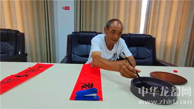 紅色經(jīng)典創(chuàng)作室內,紅紙精裁,研墨蘸筆。朱再靈與另外兩名黨員商量,一番構思后,他揮毫寫下“跟著共產(chǎn)黨共圓中國夢 脫貧致富路齊心奔小康”,筆力蒼勁,對黨的深情浸透其中。