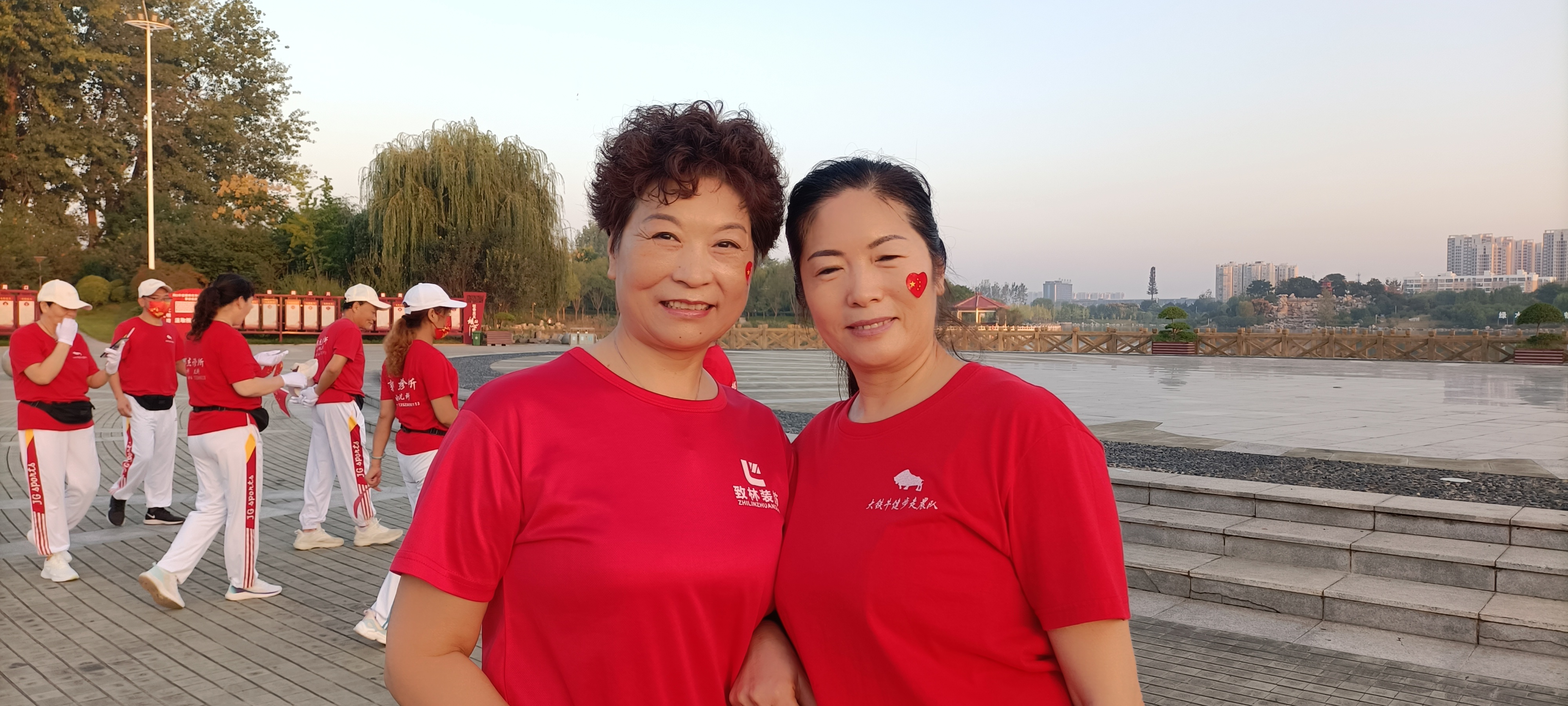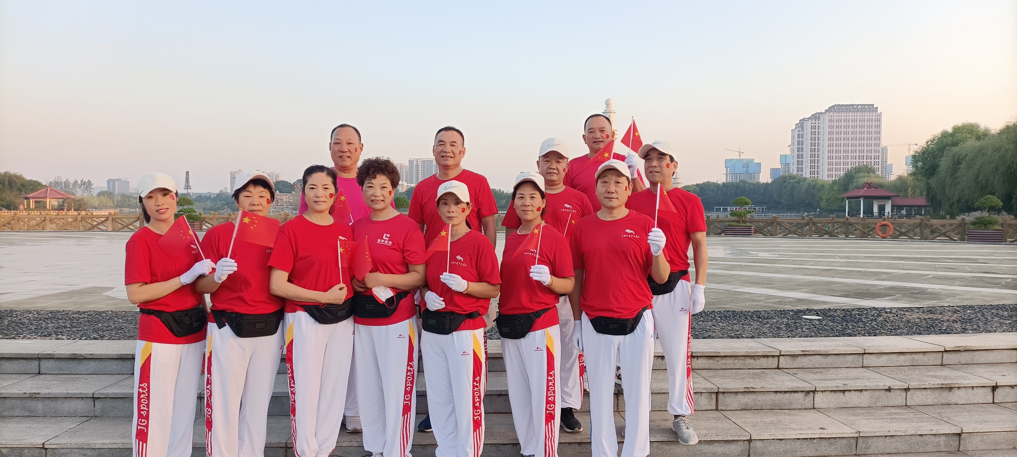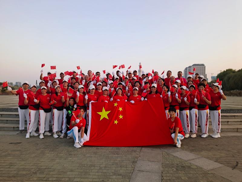 10月1日清晨,周口健步走大鐵牛晨隊的100余名隊員手持國旗,邁著矯健的步伐,迎著初升的朝陽,行走在周口公園,以健康的身姿慶祝祖國生日。周口日報·周道客戶端記者 高洪馳攝