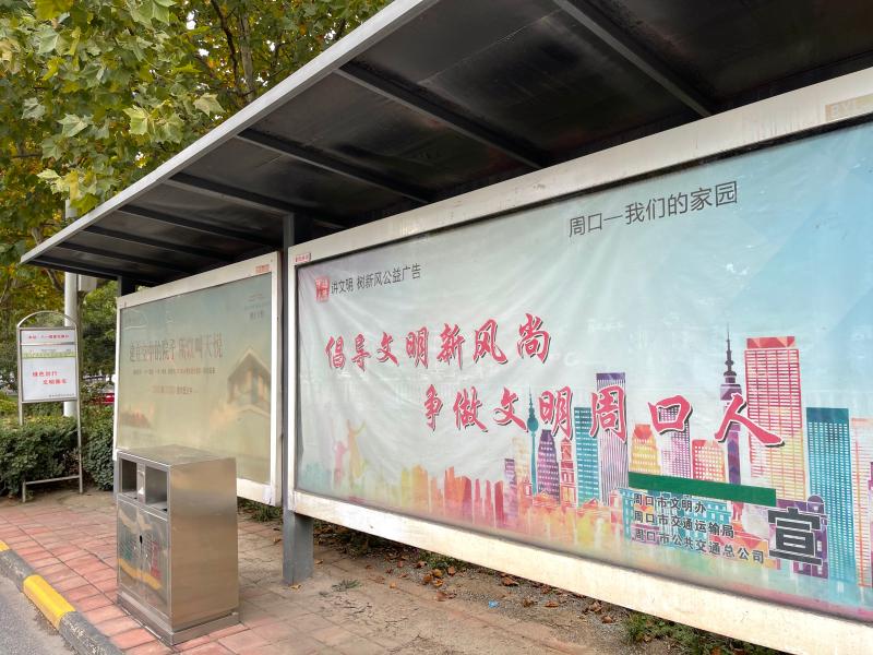 公交站臺(tái)作為城市文化傳播的符號(hào)之一,對(duì)城市形象的提升有著重要意義。10月26日,記者走訪了我市中心城區(qū)公交候車臺(tái),隨處可見的公益廣告牌引人注目,“文明與你同行,創(chuàng)建從我做起”“倡導(dǎo)文明新風(fēng)尚,爭(zhēng)做文明周口人”“舉全市之力,聚萬(wàn)眾之心,創(chuàng)文明城市,建和諧周口”,一句句文明標(biāo)語(yǔ)為周口創(chuàng)建全國(guó)文明城市增光添彩。