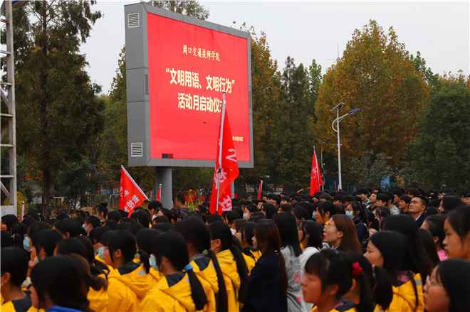 “我是周口交通技師學(xué)院的一名學(xué)生,從今天起,我要講禮儀、懂禮貌、不說臟話……積極參加“文明用語、文明行為”主題實踐活動,爭做文明學(xué)生。”10月26日,周口交通技師學(xué)院全體師生在學(xué)院“文明用語、文明行為”活動月動員會上集體宣誓。師生們堅定的目光和錚錚的誓言,展現(xiàn)出青年學(xué)子講文明話、辦文明事、做文明人的堅定決心。