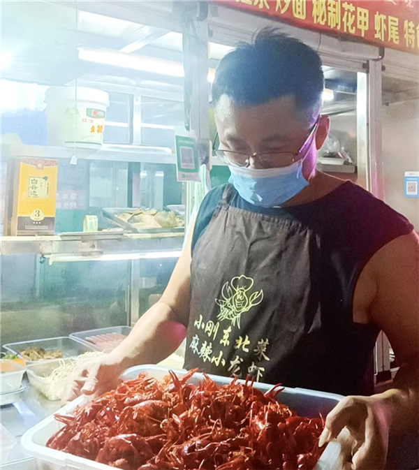此時(shí),在“東北小剛”麻辣小龍蝦夜攤前,已經(jīng)擺放好了幾張桌子,三五成群的客人相繼前來落座??腿它c(diǎn)餐后,只見攤主“小剛”就站在操作臺前,手腳麻利地將提前準(zhǔn)備好的小龍蝦等菜品一一裝盤,然后送到客人面前,忙得不可開交。