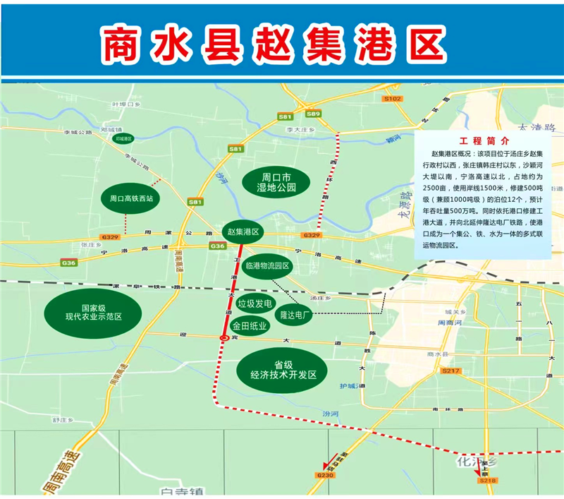 2017年,商水縣政府按照前瞻30年、謀劃15年、做實(shí)近5年工作要求,開(kāi)始規(guī)劃修建位于湯莊鄉(xiāng)趙集行政村以西,張莊鎮(zhèn)韓莊村以東,沙潁河大堤以南,寧洛高速以北的趙集作業(yè)區(qū)。規(guī)劃建設(shè)占地約720畝、總投資6.37億元的趙集港項(xiàng)目,同時(shí)修建12個(gè)1000噸級(jí)泊位,其中散貨泊位8個(gè),通用泊位2個(gè),多用途泊位2個(gè),占用岸線1250米,預(yù)計(jì)年吞吐量達(dá)475萬(wàn)噸。碼頭采用順岸式布置,結(jié)構(gòu)采用重力式扶壁結(jié)構(gòu),前沿配置30噸門座式固定吊裝卸作業(yè)。港口涵蓋貨物拆解區(qū)、散件堆放區(qū)等4個(gè)功能區(qū),集裝箱露天堆場(chǎng)、大型貨車停車場(chǎng)等5個(gè)場(chǎng)地。圍繞趙集港,高標(biāo)準(zhǔn)規(guī)劃建設(shè)占地約6.2平方公里的多式聯(lián)運(yùn)臨港經(jīng)濟(jì)園區(qū),下設(shè)金田紙業(yè)、建材倉(cāng)儲(chǔ)兩個(gè)物流園區(qū),涵蓋建材及建材制品園區(qū)、造紙業(yè)原料及成品園區(qū)、紡織服裝原料及成品園區(qū)3個(gè)功能園區(qū)。該項(xiàng)目建成投入使用后,不但能加快商水縣紡織園區(qū)、循環(huán)園區(qū)、經(jīng)濟(jì)開(kāi)發(fā)區(qū)、隆達(dá)電廠等企業(yè)物質(zhì)的流轉(zhuǎn),而且能使商水港成為周口沙潁河重要的鐵運(yùn)、陸運(yùn)、水運(yùn)交通樞紐、貨物貿(mào)易和物流中轉(zhuǎn)聚集區(qū),從而進(jìn)一步促進(jìn)商水經(jīng)濟(jì)的健康、快速發(fā)展。