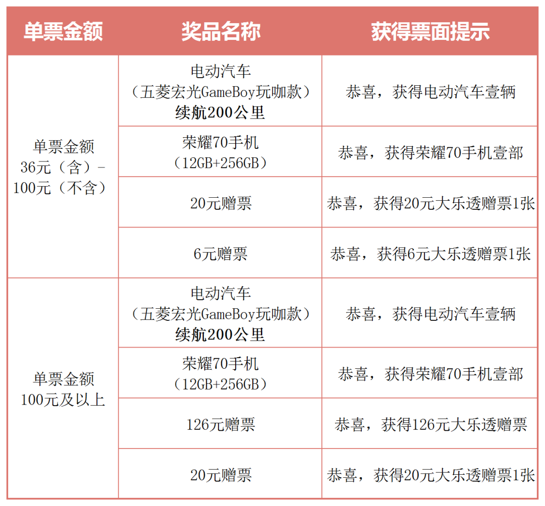 符合活動(dòng)參與條件的彩票隨機(jī)中獎(jiǎng)(100%中獎(jiǎng))。