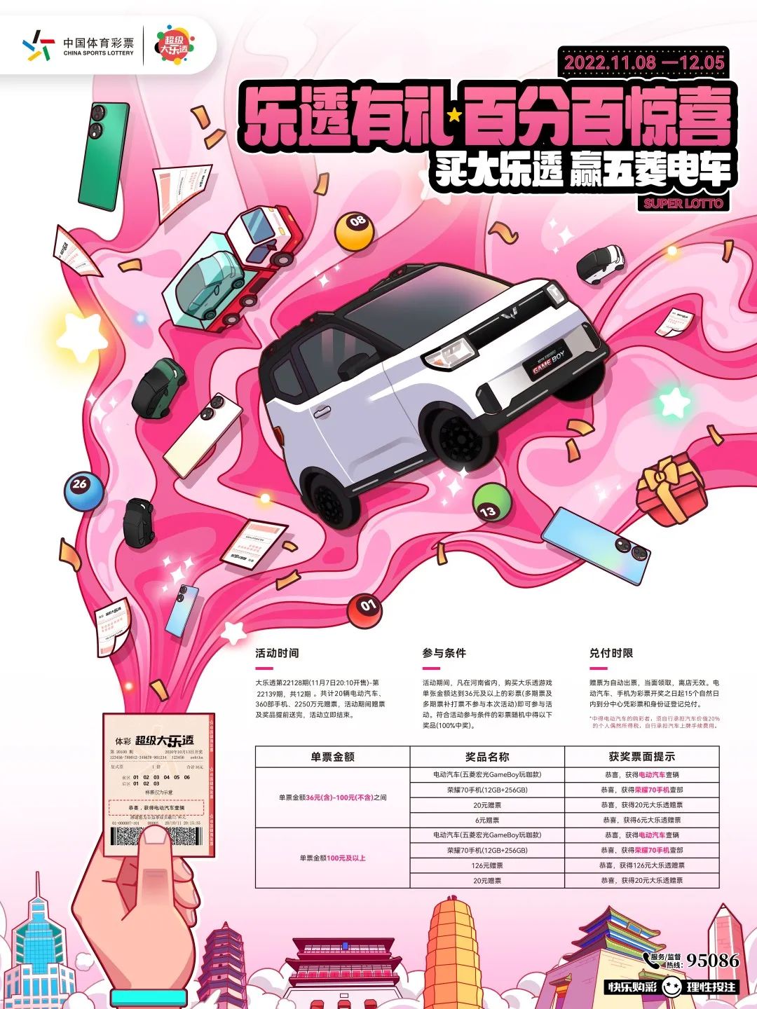 活動(dòng)期間,凡在河南省內(nèi),購買大樂透游戲單張金額達(dá)到36元及以上的彩票(多期票及多期票補(bǔ)打票不參與本次活動(dòng),以下同)即可參與活動(dòng)。有機(jī)會(huì)中得電動(dòng)汽車、榮耀70手機(jī)、126元贈(zèng)票、20元贈(zèng)票、6元贈(zèng)票等。