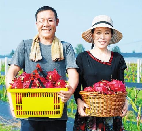 • 盛夏時(shí)節(jié),萬木蔥蘢。在太康縣清集鎮(zhèn)夢里田園火龍果種植基地,一株株仙人掌狀的火龍果成行排列,一個(gè)個(gè)飽滿的火龍果如火焰般垂掛枝頭。打扮利落的劉秀英邊用手機(jī)拍攝火龍果果皮上黃綠相間的鱗狀花萼,邊向粉絲介紹火龍果的長勢和收成情況。