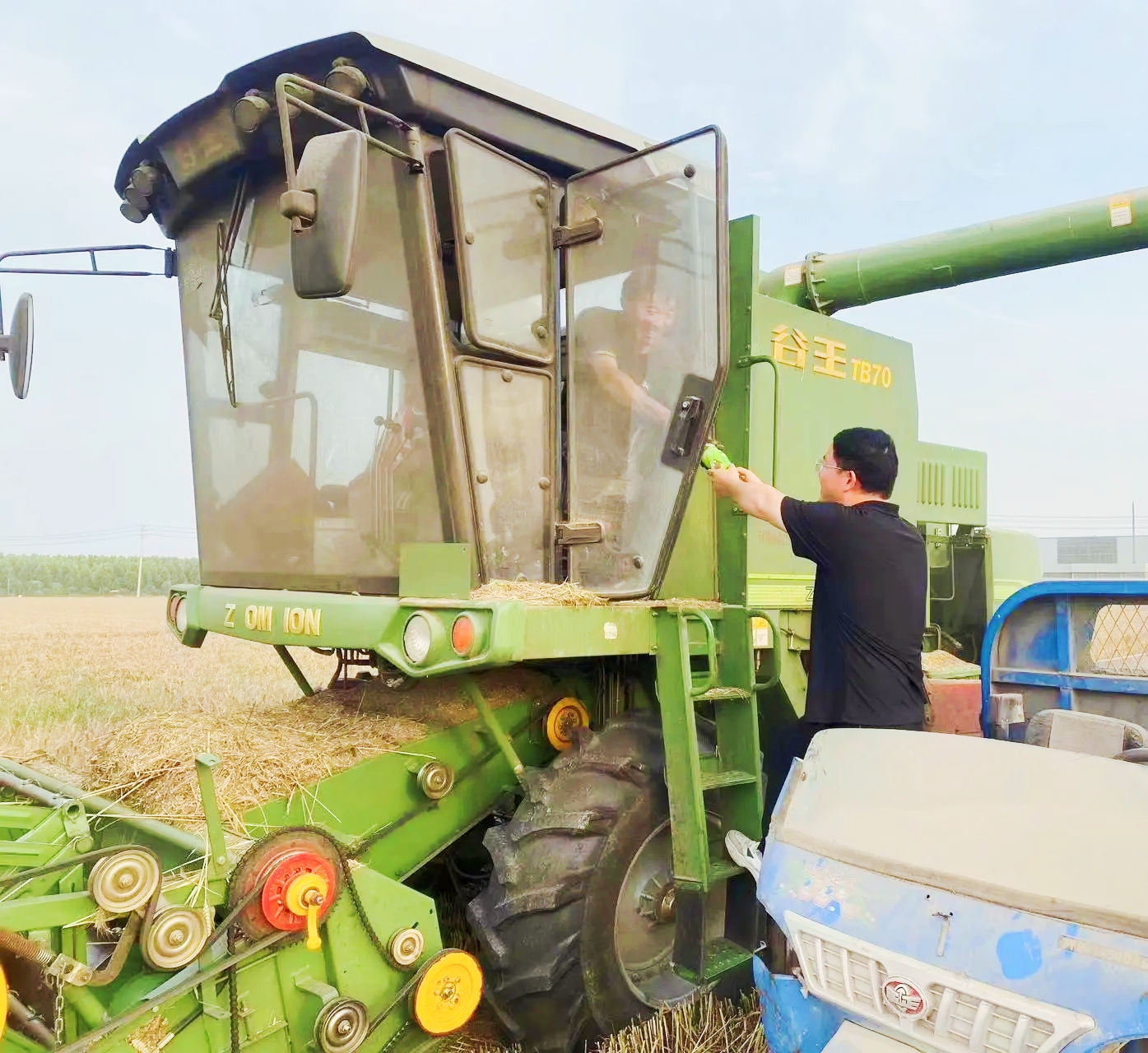 5月31日下午3時許,在許灣辦事處大張行政村村民田地里,收割機、點播機、拖拉機等農(nóng)用機械來往穿梭,村民手拿簸箕、木锨、掃帚等工具等待在地頭邊,收割下來的麥子被迅速攤開在道路上,方便晾曬?!鞍炒逡还?10多畝地今天就能收完,2天就能曬干,壓在心口上的大石頭可算落了地?!笔痉秴^(qū)許灣辦事處大張行政村村民鄭乃福說。