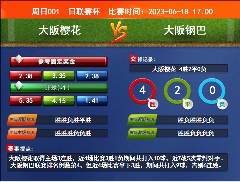 比賽時(shí)間:2023-06-18 17:00賽事提點(diǎn):大阪櫻花取得主場(chǎng)3連勝,近4場(chǎng)比賽3勝1負(fù)期間共打入10球,近7戰(zhàn)5次零封對(duì)手。大阪鋼巴聯(lián)賽排名倒數(shù)第4,但近4場(chǎng)比賽拿下3勝,期間共打入9球,告別6連敗。