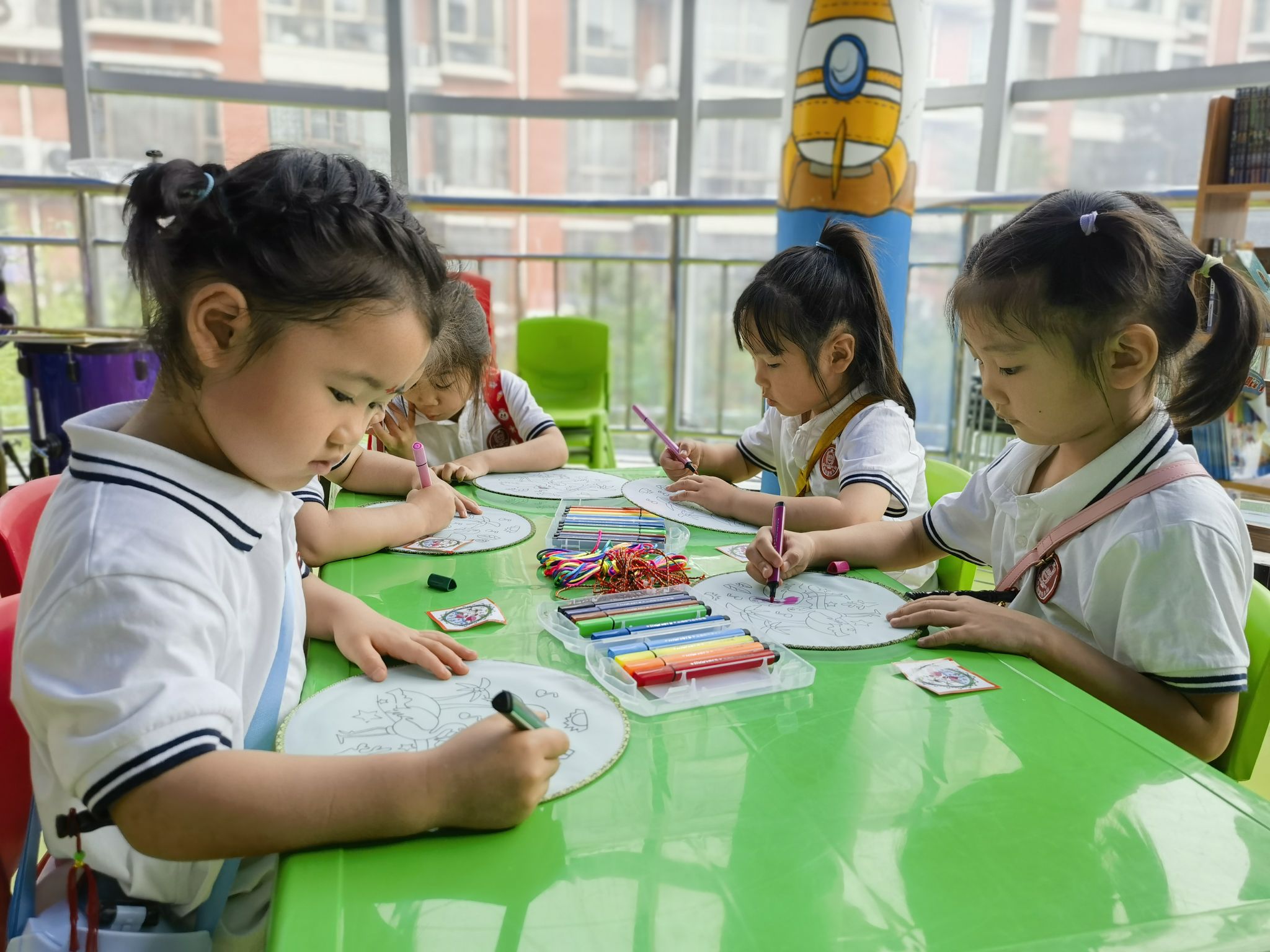 編織五彩繩是端午節(jié)的習(xí)俗之一,有祈福納吉的美好寓意;團(tuán)扇是古代扇文化的代表,有著深厚的文化底蘊(yùn)……在當(dāng)天的活動中,中原社區(qū)還邀請部分小朋友參與畫團(tuán)扇、編彩繩活動。道德文明使者給小朋友們分發(fā)了空白團(tuán)扇、顏料等,耐心地講解繪畫方法及團(tuán)扇的歷史。聽著講解,小朋友們一筆一畫在潔白的扇面上描繪出一個個色彩鮮艷的形象,一把把素面團(tuán)扇被賦予了栩栩如生的圖景,讓大家感受到了傳統(tǒng)文化的魅力。隨后,道德文明使者拿起五彩絲線,手把手教小朋友們編彩繩,讓他們感受手工藝的樂趣。“今天的活動非常有意義,我喜歡編彩繩,也喜歡畫畫?!毙∨笥褬窐罚ɑ┱f。