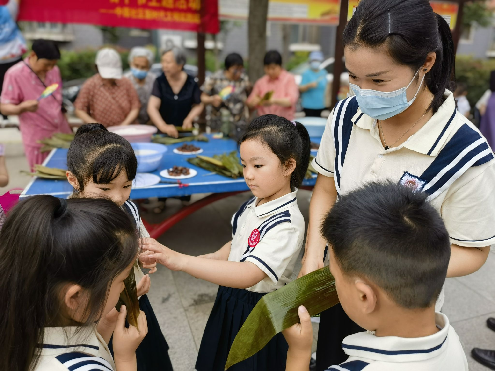 當(dāng)日8時許,社區(qū)工作人員,道德文明使者,市委辦公室、市委組織部、市檔案館機(jī)關(guān)黨員干部,金銳物業(yè)工作人員將糯米、紅棗、粽葉等包粽子必備材料準(zhǔn)備齊全,轄區(qū)居民不約而同來到現(xiàn)場“一展身手”。粽子雖小,門道不少,一折葉、二盛料、三壓實、四包嚴(yán)、五扎繩……看似簡單,但要做出餡料十足、外觀漂亮的粽子還是需要一番功夫的。有的居民沒有經(jīng)驗,不是繩子松了,就是糯米撒了,包粽子巧手楊凱阿姨耐心地指導(dǎo)“新手”,捋粽葉、做漏斗狀、填糯米、壓緊實、封口扎捆,一張張翠綠的粽葉在大家手中翩翩起舞,三角形、枕頭形、長條形的精致粽子逐漸成型?!鞍兆泳拖褡鋈俗鍪乱粯?,要清白分明,有棱有角,分寸有度,扎實穩(wěn)固?!睏畎⒁痰脑捵屧趫鼍用窦娂姽恼泣c贊。