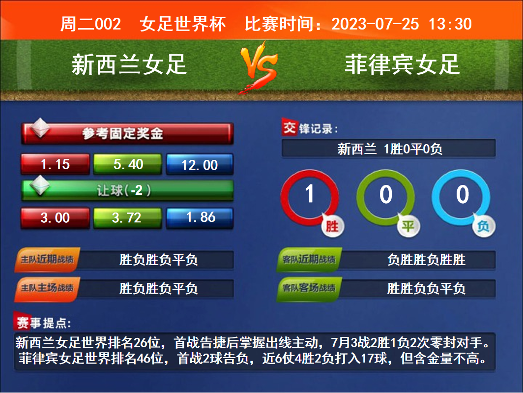 比賽時間:2023-07-25 13:30賽事提點(diǎn):新西蘭女足世界排名26位,首戰(zhàn)告捷后掌握出線主動,7月3戰(zhàn)2勝1負(fù)2次零封對手。菲律賓女足世界排名46位,首戰(zhàn)2球告負(fù),近6仗4勝2負(fù)打入17球,但含金量不高。