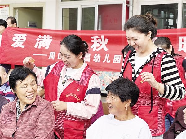 • 10月10日上午,周口市文昌幼兒園黨支部30余名黨員志愿者來到川匯區(qū)城南街道綜合養(yǎng)老中心,開展“愛滿金秋 情暖重陽”志愿服務活動。志愿者向老人送去慰問品,并表達對老年人的美好祝福。