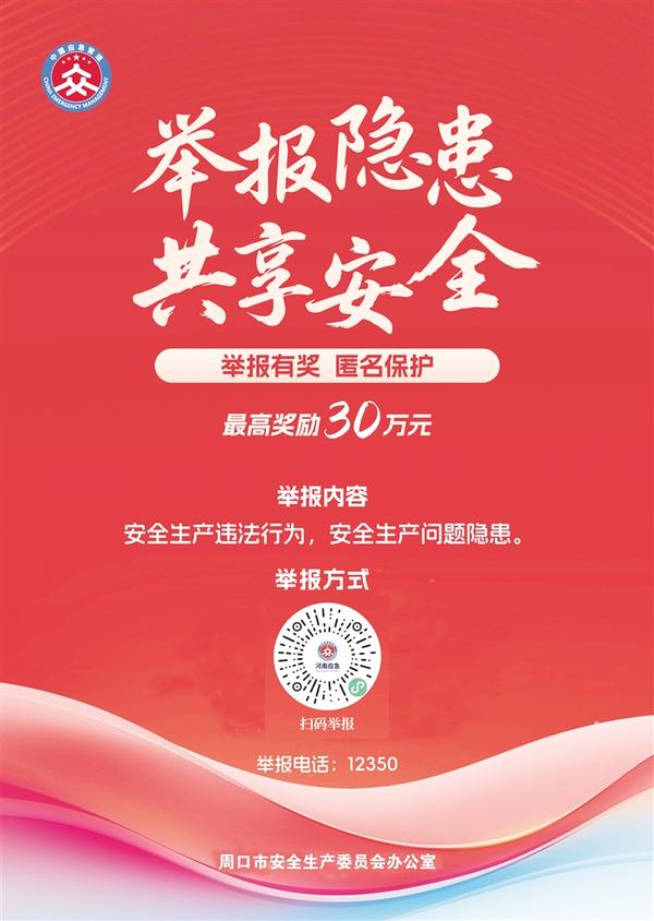 • 周口市安全生產(chǎn)委員會(huì)辦公室以舉報(bào)電話、掃碼舉報(bào)等方式,受理群眾舉報(bào)安全生產(chǎn)非法違法行為線索。一經(jīng)查實(shí),我們將依據(jù)《河南省安全生產(chǎn)領(lǐng)域舉報(bào)獎(jiǎng)勵(lì)實(shí)施辦法》相關(guān)規(guī)定,對(duì)舉報(bào)人予以獎(jiǎng)勵(lì),最高獎(jiǎng)勵(lì)金額30萬(wàn)元。我們將對(duì)舉報(bào)人個(gè)人信息進(jìn)行嚴(yán)格保密,依法保護(hù)舉報(bào)人的合法權(quán)益。