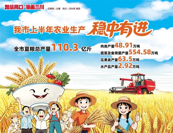 2025年上半年,我市農(nóng)業(yè)生產(chǎn)穩(wěn)中有進。全市夏糧總產(chǎn)量110.3 億斤,同比增長0.01%,980.1萬畝秋糧長勢良好,豐收豐產(chǎn)基礎(chǔ)扎實;肉類產(chǎn)量48.91萬噸,同比增長3.19%;蔬菜及食用菌產(chǎn)量554.58萬噸,同比增長3.28%;瓜果類產(chǎn)量63.5萬噸,同比增長3.73%; 水產(chǎn)品產(chǎn)量2.92萬噸,同比增長4.2%。記者 付永奇 周彥 文/圖
