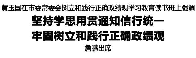本報(bào)訊 (記者 王艷 王晨) 根據(jù)樹(shù)立和踐行正確政績(jī)觀學(xué)習(xí)教育工作安排,3月16日至17日,市委常委會(huì)用兩天時(shí)間,采取集中自學(xué)和交流研討相結(jié)合的方式,舉行樹(shù)立和踐行正確政績(jī)觀學(xué)習(xí)教育讀書(shū)班。市委書(shū)記黃玉國(guó)主持并講話,強(qiáng)調(diào)要深入學(xué)習(xí)貫徹習(xí)近平總書(shū)記關(guān)于學(xué)習(xí)教育的重要指示精神、關(guān)于樹(shù)立和踐行正確政績(jī)觀的重要論述,全面落實(shí)立黨為公、為民造福、科學(xué)決策、真抓實(shí)干總要求,切實(shí)增強(qiáng)樹(shù)立和踐行正確政績(jī)觀的思想自覺(jué)和行動(dòng)自覺(jué),為實(shí)現(xiàn)“十五五”良好開(kāi)局、奮力譜寫(xiě)中原大地推進(jìn)中國(guó)式現(xiàn)代化周口新篇章提供堅(jiān)強(qiáng)保障。市長(zhǎng)詹鵬出席。
