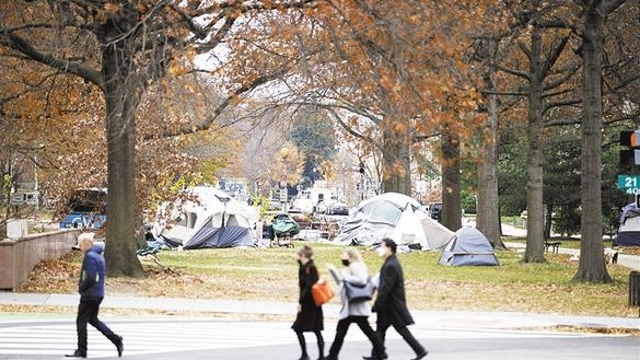 12月8日,在美國華盛頓,行人經(jīng)過無家可歸者居住的帳篷?!?a href="http://www.13311315375.com/content/2021-12/11/content_962080.html" target="_blank" >[詳細(xì)]