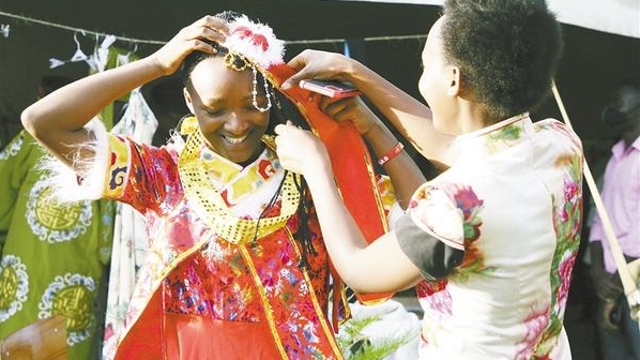11月10日,學(xué)生在盧旺達(dá)卡永扎試穿中國(guó)服飾?!?a href="http://www.13311315375.com/content/2021-11/13/content_959142.html" target="_blank" >[詳細(xì)]
