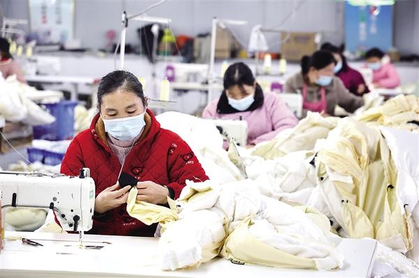 近年來,淮陽區(qū)四通鎮(zhèn)中營子村以黨建為核心引擎,筑牢基層戰(zhàn)斗堡壘,牽頭建起現(xiàn)代農(nóng)業(yè)服務(wù)合作社、種植合作社等,走出“黨組織搭臺、企業(yè)唱戲、群眾受益”的強村路徑。圖為村民在村辦服裝廠工作。