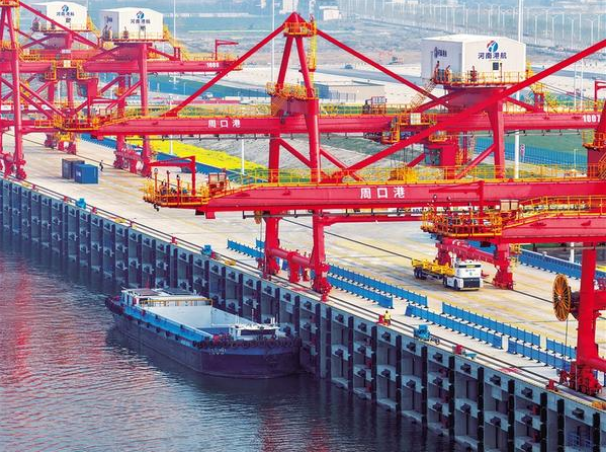 這是3月31日拍攝的周口港中心港區(qū)中心作業(yè)區(qū)碼頭(無人機(jī)照片)。 作為全國(guó)36個(gè)內(nèi)河主要港口之一,河南周口港近年來不斷拓展對(duì)外開放格局,深度融入國(guó)際國(guó)內(nèi)港口群。