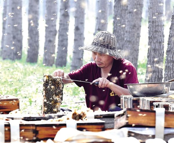 3月31日上午,西華縣李大莊鄉(xiāng)的潁河岸邊,來(lái)自遲營(yíng)鎮(zhèn)的蜂農(nóng)在金黃的油菜花、粉嫩的桃花花海中放蜂采蜜,在春光花影中迎來(lái)一年中最忙碌的時(shí)節(jié)。