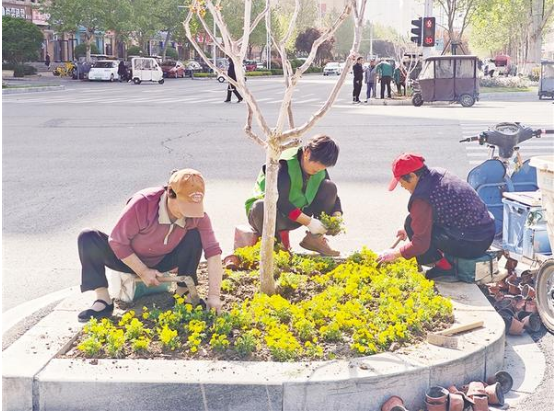 近日,多名園林綠化工人在周口大道與慶豐中路交叉口進行花草更換補種作業(yè)。