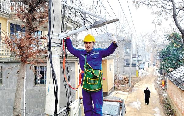 近日,鄲城縣宜路鎮(zhèn)劉老莊村民劉中新在村口安裝路燈。