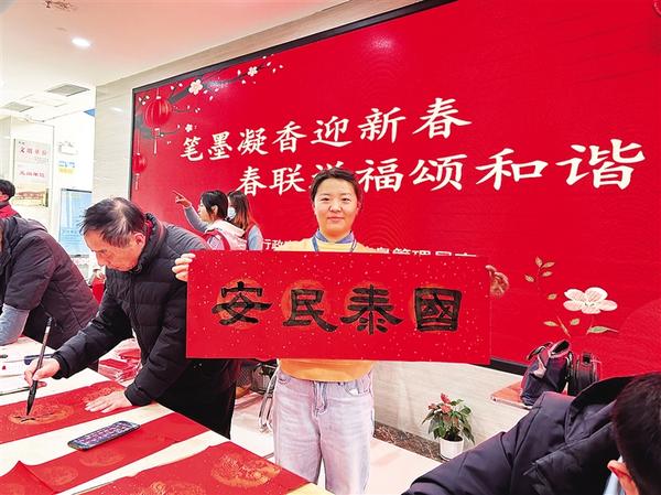 1月20日,扶溝縣政務(wù)服務(wù)中心一名工作人員展示剛收到的手寫(xiě)春聯(lián)。連日來(lái),我市數(shù)千余名書(shū)法家、書(shū)法愛(ài)好者為市民寫(xiě)春聯(lián)、送“?!弊?,送上美好的祝福。
