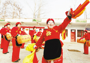 ?、芊鰷峡h江村鎮(zhèn)江南盤鼓隊正在村室緊張排演節(jié)目。春節(jié)期間,她們走上街頭,為當?shù)厝罕娝蜕衔幕蟛汀?nbsp; (記者  王 映  攝)